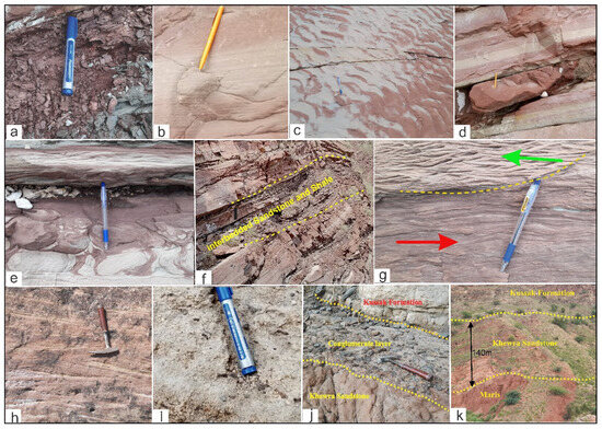 Outcrop observations during the fieldwork (Figure 3a–k) identified five distinct lithofacies in the four studied sections of the Khewra Sandstone (Table 2). The characteristics of each lithofacies are discussed below: