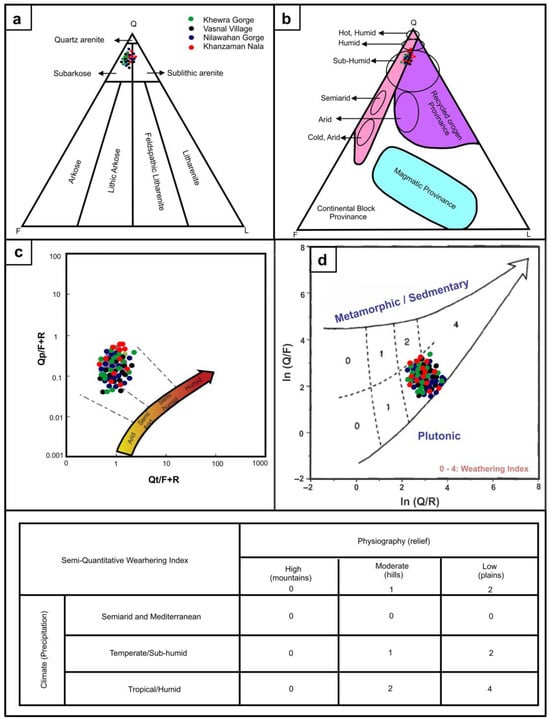Petrographic data of the Khewra Sandstone plotted using various classification and interpretive diagrams; (a) the QFL ternary plot shows that the sandstones are classified as sub-arkose and sub-lithic arenite; (b) the QFL plot shows the paleoclimate of the Khewra Sandstone as sub-humid, along with the continental block provenance to the formation; (c) the Qp/F + R vs. Qt/F + R bivariate diagram shows a semi-arid to semi-humid paleoclimate [63]; and (d) ln(Q/F) vs. ln(Q/R) plot almost plain relief with low to moderate weathering conditions [41].