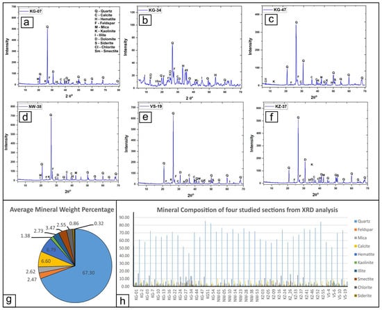 X-ray Diffraction (XRD) diffractograms of selected samples from the Khewra Sandstone across the studied sections. (a) KG-7: a sandstone sample from the lower part of the formation in the KG section; (b) KG-34: a shale sample from the middle part of the KG section; (c) KG-47: a sandstone sample from the upper part of the KG section; (d) NW-38: a sandstone sample from the middle part of the NW section; and (e) VS-19: a sandstone sample from the upper part of the vs. section; (f) KZ-37: a sandstone sample from the upper part of the KZ section. (g) A pie chart and (h) statistical bar chart summarizing the overall mineralogical composition of the Khewra Sandstone across the four studied sections.