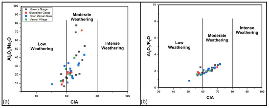 (a) Al2O3/Na2O vs. CIA; (b) Al2O3/K2O vs. CIA; both plots show low to moderate weathering for the source rocks of the Khewra Sandstone [50].