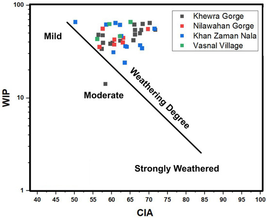 WIP vs. CIA plot showing low to moderate weathering [66,67].