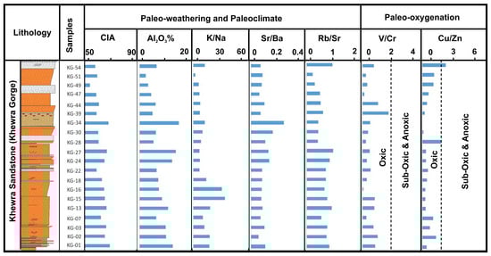 Geochemical proxies illustrating paleoclimatic, paleo-weathering, and paleo-redox conditions of the Khewra Sandstone. Combined plots of the Chemical Index of Alteration (CIA), Al2O3, K/Na, Sr/Ba, Rb/Sr, V/Cr, and Cu/Zn ratios from the representative Khewra Gorge stratigraphic section suggest an arid to semi-arid paleoclimate, low to moderate intensity of chemical weathering, and predominantly oxic to sub-oxic depositional conditions [47,48,49,56,57,58,59,60,68,69].