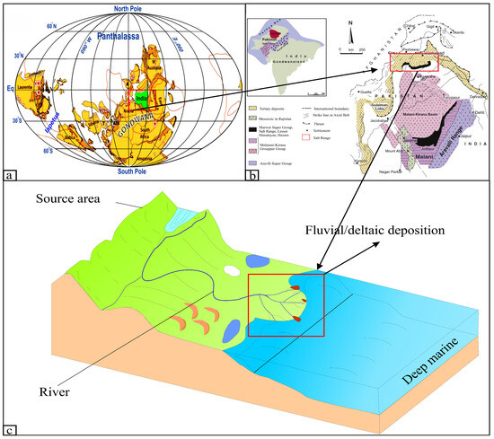 During the Early Cambrian, Gondwana was the dominant landmass that formed following the breakup of the supercontinent Rodinia. It included present-day Africa, South America, Antarctica, Australia, Europe, India, and parts of Asia (Figure 1a) [13]. Gondwana rotated counter-clockwise, causing the eastern margin to drift northward [14,15]. By the end of the Cambrian, this continental mass had migrated southward again, likely reaching between 10° and 15° south latitude [6]. The Salt Range [16,17,18] and the northwestern margin of the Indian Plate [19,20] occupied a high-latitude paleogeographic position during the Cambrian, likely between 30° and 60° south of the equator [21,22,23,24]. At that time, the region lay along the northern passive margin of Gondwana and was influenced by arid to semi-arid climatic conditions, which favored the deposition of extensive evaporite and siliciclastic sequences [21,22,23,24,25]. The Khewra Sandstone was deposited unconformably over the salt and gypsum-rich evaporites of the underlying Precambrian Salt Range Formation [16,17], reflecting a transition from restricted evaporitic to more open marine and fluvial environments. The Indian Plate, as part of Gondwana, contributed to this paleogeographic setting [18,19,20,21,22].