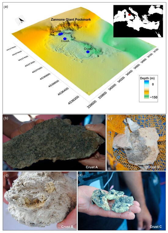Sediment samples and remotely operated vehicle (ROV) videos were acquired during a research cruise conducted in 2014 by the National Research Council–Institute of Environmental Geology and Geoengineering (CNR-IGAG), aboard the R/V Urania. Authigenic crusts were recovered from the seafloor within the ZGP, at water depths ranging from 128 to 135 m (Table 1).