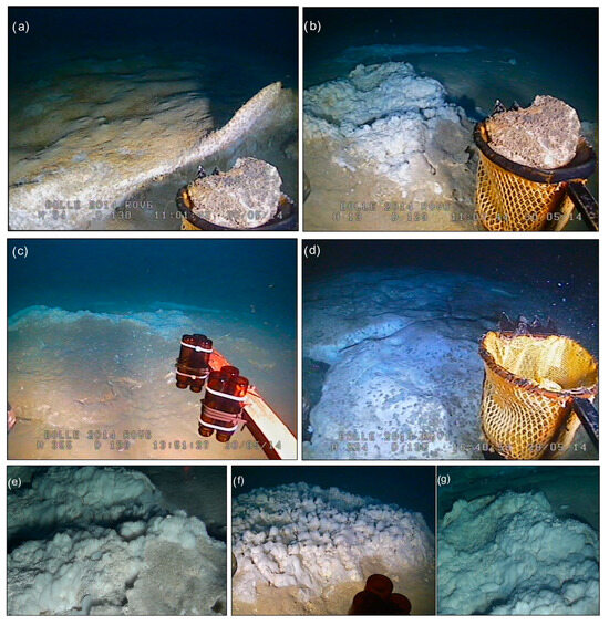 Crust A was recovered from a sub-circular, crater-like depression in the northeastern sector of the ZGP, at a water depth of 128 m. As previously reported in [27], Crust A is a lithified crust composed of yellow-brown cemented sand, exhibiting macroscopic evidence of both coated grains and microbial activity, including visible bacterial filaments and dark organic mats (Figure 1b and Figure S1). The coated grains appear as yellow concentric layers of mineral precipitates (primarily silica and sulfur), which may result from repeated cycles of microbial activity and mineral deposition (Figure S1). This crust has a multi-level flange shape and a thickness of approximately 5 cm. The surrounding seafloor is covered with widespread white bacterial aggregates (Figure 2a), often associated with continuous or intermittent bubble streams. The bacterial aggregates form linear and circular patterns with a thickness of about 5–10 cm. Upon closer inspection, these aggregates appear as white gelatinous spheres, collectively forming a sub-circular mat structure on the seafloor (Figure 2e–g).