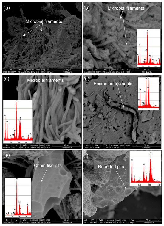 SEM observations also provide indirect evidence of biological activity, as evidenced by sulfur and silica minerals exhibiting extensive dissolution pits on their surfaces. These microbe–mineral traces show shapes ranging from elongated to sub-rounded or rounded (Figure 4e,f). Chain-like formations of dissolution pits are also visible (Figure 4e), with sizes ranging from 2 to 15 µm. In some cases, these pits overlap, creating interconnected channels.