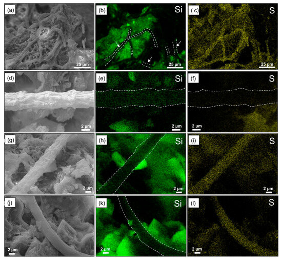 Figure 5. (a,d,g,j) Back-scattered images and (b,e,h,k) X-ray elemental maps (512 × 400 pixel mapping resolution) showing Si and S minerals (c,f,i,l) precipitates on isolated microbial filaments and in correspondence with microbial network areas of the different areas of the Crust A.