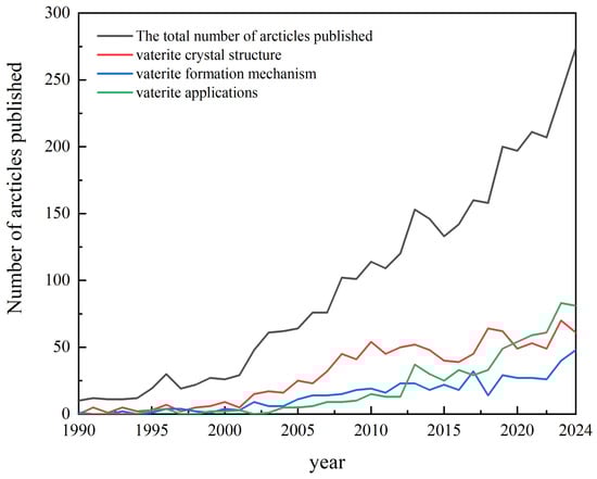 Since the first report of the mineral by the German mineralogist Vater in 1897 [], vaterite research has progressed through three phases: the period of structural exploration (1900s–1960s), the period of mechanistic analysis (1970s–2000s), and the period of expanding applications (2010s–present). Bibliometric analysis (Figure 1) shows that 3108 papers were published in the Web of Science (WoS) database between 1990 and 2024, with 61.84% published in the last decade; research topics are now heavily focused on practical applications. Overall, crystal structure (accounting for 33.62%), formation mechanism (accounting for 15.99%), and application development (accounting for 21.69%) constitute the three core research directions. In this paper, we systematically review the breakthroughs in recent years, focusing on the unified model of monoclinic crystal structure, non-classical crystallization pathways, and interdisciplinary application scenarios, with the aim of providing theoretical frameworks and technological insights for the development of the field.
