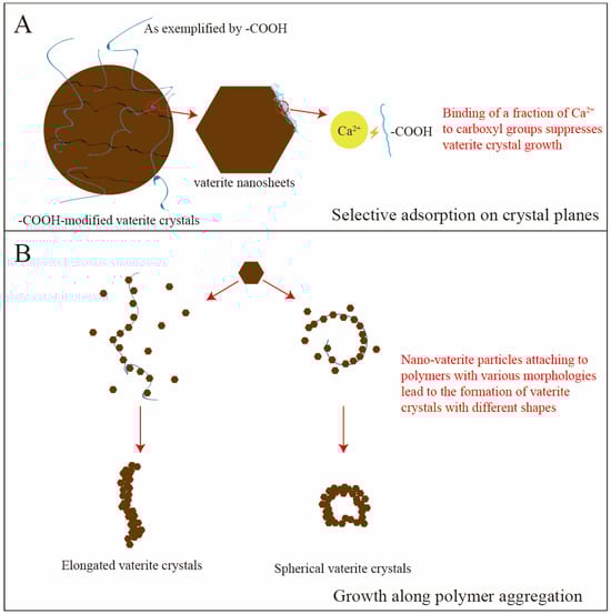 Schematic diagram of interfacial control and spatial confinement effects by DHBCs on vaterite. (A) -COOH in the solution attaches to the vaterite crystal surface and binds with Ca2+ ions on its specific crystal planes, thereby hindering the transformation of vaterite; (B) Vaterite nanosheets adsorb onto DHBC and grow along them, forming particles with diverse morphologies.