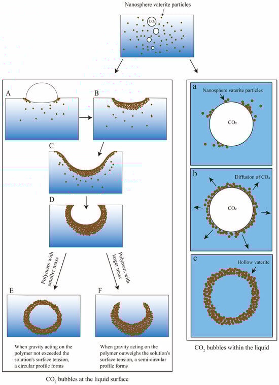 Surface tension effects on vaterite’s morphology and schematic of the CO2 bubble templating method for hollow vaterite synthesis. (A) Vaterite nanoparticles aggregate around the CO2 bubble interfaces at the liquid surface; (B) particles accumulate; (C) further particle aggregation proceeds continuously; (D) surface tension drives the formation of quasi-spherical aggregates; (E) when interfacial tension overcomes gravitational force on the aggregate, it develops into a perfect sphere through structural refinement; (F) when gravitational force dominates interfacial tension, hemispherical aggregates settle to the bottom. The diminished probability of particle adhesion on their surfaces results in stabilized hemispheres. (a) Vaterite particles adhere to CO2 bubble surfaces (CO2 bubble serving as mineralization templates); (b) disintegration of CO2 bubbles occurs; (c) hollow vaterite microspheres.