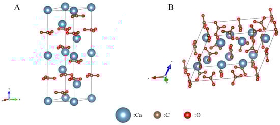 Crystal structures of calcite and vaterite: (A) calcite crystal structure; (B) vaterite crystal structure.