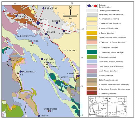 30. Dean, W.T.; Monod, O. The Lower Palaeozoic stratigraphy and faunas of the Taurus Mountains near Beyşehir, Turkey. Bull. Br. Mus. (Nat. Hist.) Geol. 1970, 19, 411–426. [Google Scholar]