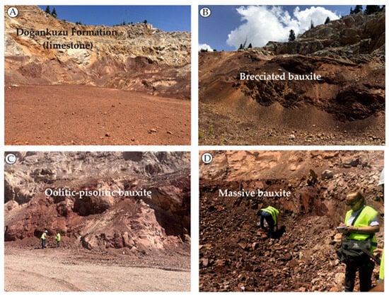 The study area is situated within the Seydişehir–Akseki region, characterized by complex stratigraphy dominated by autochthones and allocthones tectonic units [18]. The Çaltepe Formation, representing the oldest lithostratigraphic unit in the region and dated to the Lower–Middle Cambrian, is composed of dolomite, dolomitic limestone, limestone, and phyllite-schist lithologies [19,30]. The Seydişehir Formation, which dates to the Upper Cambrian–Lower Ordovician, comprises low-grade metamorphosed schist, phyllite, quartzite, sandstone, and nodular limestone. This formation is widely observed across the region and has also been proposed as a potential source rock for bauxite and found is observed at the base of the study area [18]. The Middle–Late Cambrian Seydişehir Formation exhibits a transitional contact with the Çaltepe Formation and unconformably overlies the Bozkır ophiolitic mélange, which consists predominantly of gabbro/diabase, amphibolite, serpentinite, radiolarite, limestone, and tuff lithologies of Jurassic–Cretaceous age. The emplacement of this mélange occurred through tectonic contact during the Late Eocene–Early Miocene period. The Dogger-aged unit is conformably overlain by the Katrangediği Formation, which is of Cenomanian–Maastrichtian age and entirely composed of carbonate rocks including different sizes with dissolution cavities that serve as primary sites for bauxite mineralization. This unit is unconformably overlain by the Doğankuzu Formation, also of Cenomanian–Maastrichtian age (Figure 2). At the base of the unit, brecciated limestones weakly cemented by bauxite and earthy bauxite containing pyrite crystals of several millimeters in size are observed. In the upper levels, oolitic–pisolitic bauxite and partially oolitic massive bauxite are present. These two types of bauxite generally exhibit lateral gradation into one another. In addition, dark reddish-brown bauxites are present at these levels. Above the massive bauxite, weakly consolidated earthy bauxite with a yellowish to light reddish-brown color and a composition distinct from that of the basal earthy bauxite is observed. Bauxite deposits are located either on or within the Katrangediği Formation, primarily within large, lens-shaped karstic depressions that are several hundred meters in length and width, as well as in smaller sinkholes and fractures. The fact that the Katrangediği Formation is composed of micritic limestone suggests deposition in a low-energy, shallow marine (lagoonal) environment.