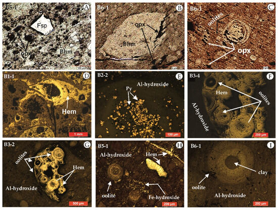 Figure 4. Microscopic images include both thin and polished sections of the samples. Thin section images show broken feldspar and boehmite minerals (B5-1) within earthy bauxite (A), as well as the localization of opaque minerals (hematite) along oolitic rings and at the edges of boehmite cracks (B,C). Polished section images reveal hematite in matrix (D), oolites (F,G), and cracks (H), framboidal pyrite (E), and aluminum hydroxide minerals in bauxites containing oolites of varying sizes (EI) (Hem: hematite, Py: pyrite, opx: opaque minerals; Note: abbreviations are in Table 1).