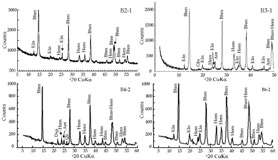 Figure 5. X-ray diffractograms of selected bauxite samples are presented, illustrating the mineralogical composition of the samples. The dominant phases identified include boehmite, hematite, and minor amounts of anatase, kaolinite, and quartz (Note: abbreviations are in Table 1).