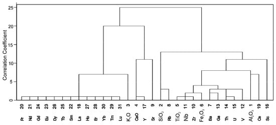 Figure 6. Hierarchical cluster analysis of major element oxides and trace elements in the bauxite samples, illustrating geochemical groupings and associations among elements.