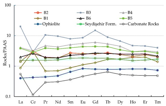 Figure 8. The PAAS-normalized REE pattern of the bauxites, ophiolitic rocks, carbonates, and the Seydişehir Formation (note: REE contents of Seydişehir schists, Bozkır ophiolitic mélange, and carbonate rocks are taken from [18,35,36], respectively).