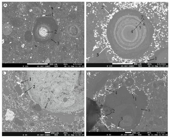 Figure 9. Backscattered electron (BSE) images showing prismatic crystals surrounding oolites and dispersed within the matrix in the B3-2 sample, along with selected analyzed crystals/grains from sample B3. Images (AC) through (D) contain 4, 5, 7, and 4 EPMA analysis points, respectively. The analysis points are labeled as a-1 to a-3, b-1 to b-7, c-1 to c-3, and d-1 to d-5, which correspond to the data listed in Table 3.