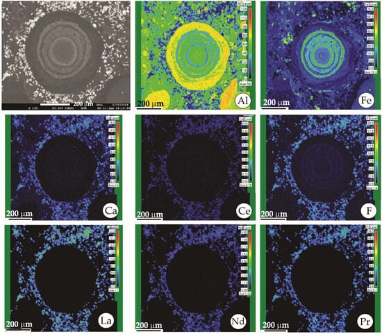 In the element maps obtained from FESEM, LREE was found to be concentrated in the specific areas, and the elemental compositions identified by EDS were consistent with the region showing high LREE intensities on the maps. In sample B3-2, the LREEs, along with Al, Fe, Ca, and F, were mapped within the oolite and the surrounding white prismatic crystals (Figure 10). It was observed that La, Ce, Nd, and Pr—among the REEs—were concentrated in the white grains, whereas other REESs were not detected in these LREE-enriched areas. Ca and F were also observed in the regions with high LREE content, while Al and Fe were distributed in different rings of the oolite. Al is also more concentrated in distinct concentric rings within the oolite, with Al being particularly concentrated in the dark-gray ring. The co-occurrence of LREEs, Ca, and F in the same areas suggests that the REE-bearing mineral is La-parisite, given its composition (containing Ca and F) and the predominance of La over Ce.