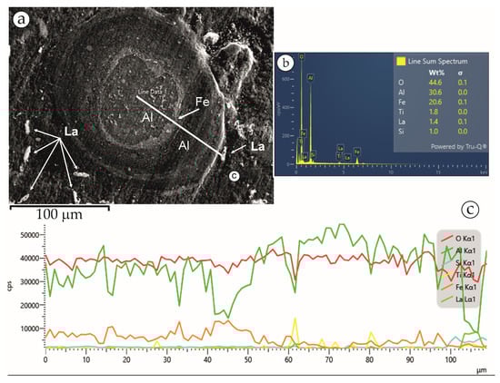 In samples with high REE content, the compositional variations in the oolites and grains surrounding the oolites were examined in terms of major elements and REE concentrations using linear spectrum analysis (Figure 11). The spectrum revealed that the gray-black oolite rings are enriched in Al (30.6%), while the thin, light-colored rings exhibit elevated Fe content (20.6%) (Figure 11b,c). The concentrations of Si, Ti, and La were all below 2%. The compositional variations in oxygen levels from the core of the oolite to the outer ring generally followed a trend parallel to that of Al, and to a lesser extent, Fe. In the linear spectrum, the inverse relationship between Fe and Al-bearing mineral precipitated during different stages under oxidizing conditions (Figure 11c). Furthermore, no clear correlation was observed between the variation in La content and changes in Al and Fe concentrations.