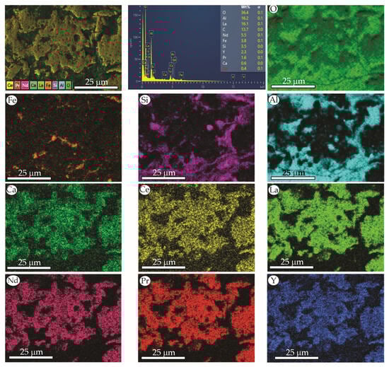 In the analyses conducted, La was found to be the most abundant REE, with concentrations ranging from 20% to 28%, exceeding the typical La content reported for La-bastnäsite and parisite in the literature [64,65]. According to Leleyter et al. [66], unbalanced REE distribution may be primarily associated with carbonates, Fe-oxides/hydroxides, or organic matter. However, the absence of a correlation between REEs and CaO or Fe2O3, as well as the spatial separation of these elements in elemental mapping, suggests that REEs in the studied samples are not bound to these phases.