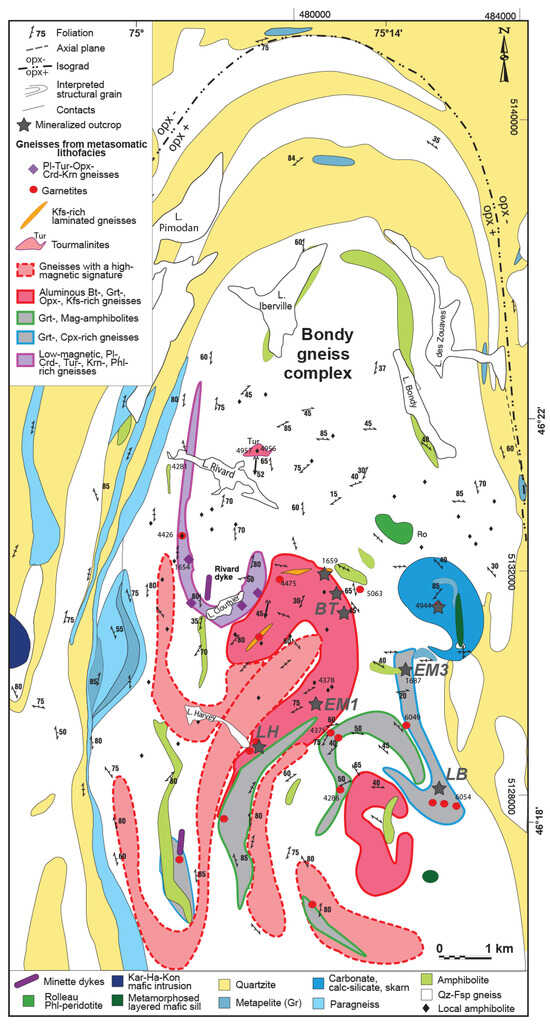 Simplified geological map of the northern part of the Bondy gneiss complex (modified and information added from Refs. [4,45,46]). Mineralized zones include the Breccia Trail (BT), Lac Bing (LB), Lac Harvey (LH), and the EM1 zones of outcrops and the EM3 mineral occurrence with a magnetite ironstone (IOA-type mineralization).