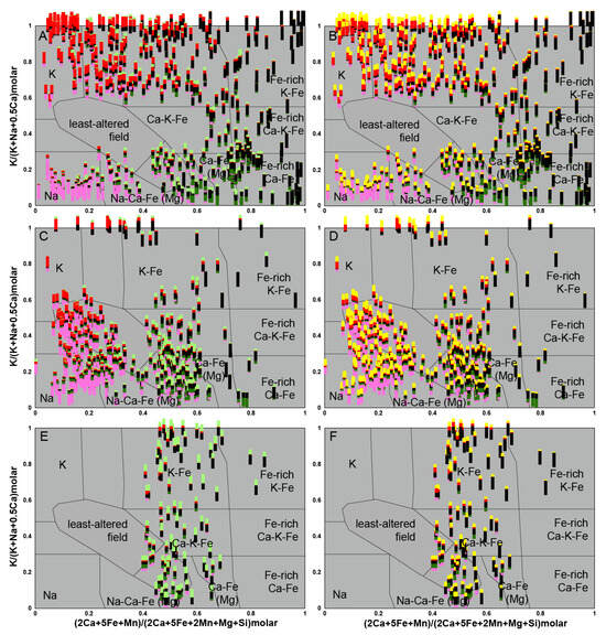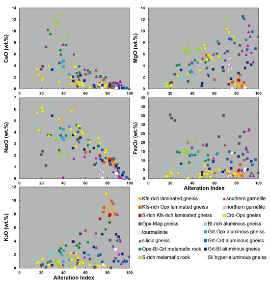 Alteration index (AI) versus CaO, MgO, Na2O, Fe2O3t, and K2O. AI = 100 (K2O + MgO)/(K2O + MgO + Na2O + CaO). Mineral abbreviations follow Warr [54]. Source of data listed in Table S1.