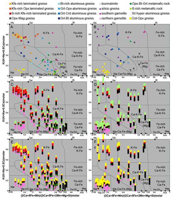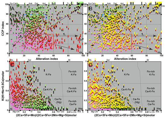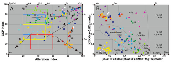 Alteration box plot for the facies from the northern part of the Bondy Gneiss complex. (A) AI versus CCPI alteration box plot after Large et al. [29]. 1 and 4: biotite alteration; 2: K-feldspar alteration; 3: chlorite alteration; 5: chlorite alteration; 6: albite alteration. Green-, blue-, yellow- and red-contoured boxes are the field of composition of igneous rocks with SiO2 contents lower than 52 wt%, between 52 and 63 wt%, between 63 and 69 wt%, and higher than 69 wt%, respectively [13]. (B) (2Ca + 5Fe + Mn)/(2Ca + 5Fe + 2Mn + Mg + Si)molar versus K/(K + Na + 0.5Ca)molar AIOCG alteration box plot after Montreuil et al. [20]. Symbols as in Figure 5. Source of data listed in Table S1.