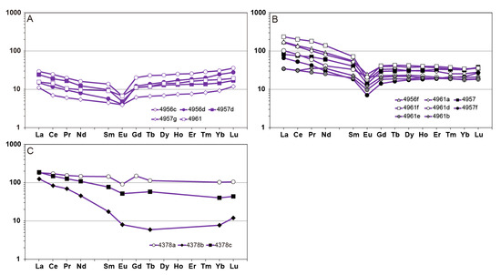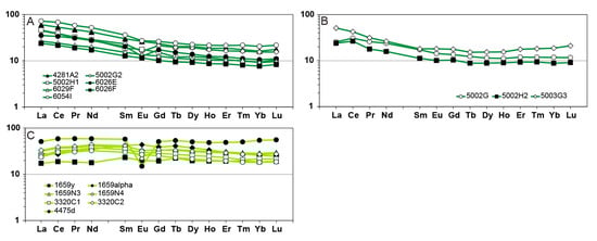 Chondrite-normalized rare earth element diagrams of orthopyroxene-biotite-garnet and sulfide-rich metamafic rocks. (A,B) Orthopyroxene-biotite-garnet metamafic rocks; (C) Sulfide-rich metamafic rocks. Normalization according to Sun and McDonough [55]. Source of data in Table S1.