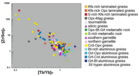 K-feldspar-rich laminated gneisses and biotite-orthopyroxene layers have high Zr contents (249–434 ppm), and [Zr/Sm]n ratios greater than unity (1.6–4.0), without any correlation between [Zr/Sm]n and [Tb/Yb]n ratios (Figure 8). In contrast, sulfide-rich layers, with high Zr contents (340–391 ppm) and [Zr/Sm]n ratios (8.6–368) show a correlation between [Zr/Sm]n and [Tb/Yb]n ratios (Figure 8).