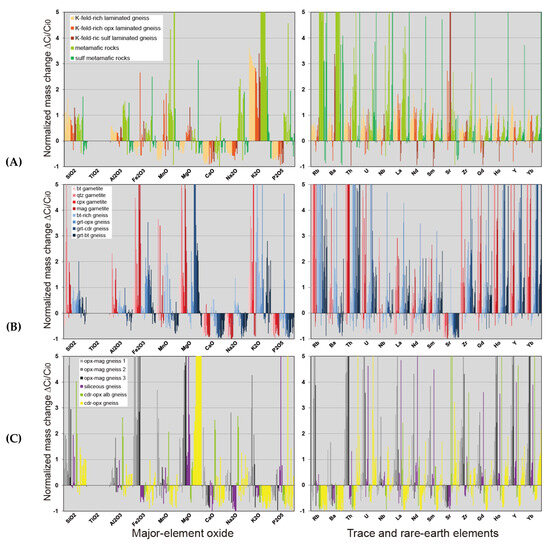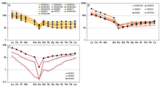 Chondrite-normalized rare earth element diagrams of K-feldspar-rich laminated gneisses. (A) K-feldspar-rich laminated gneisses; (B) Biotite-orthopyroxene-rich K-feldspar-rich laminated gneisses; (C) sulfide-rich K-feldspar-rich laminated gneisses. Normalization according to Sun and McDonough [55]. Source of data listed in Table S1.