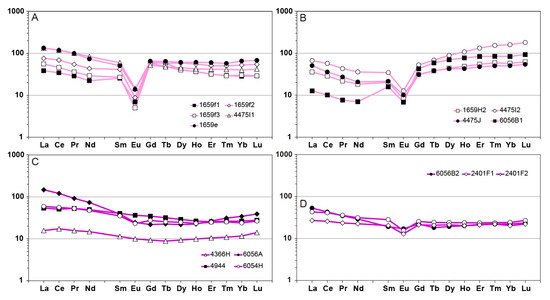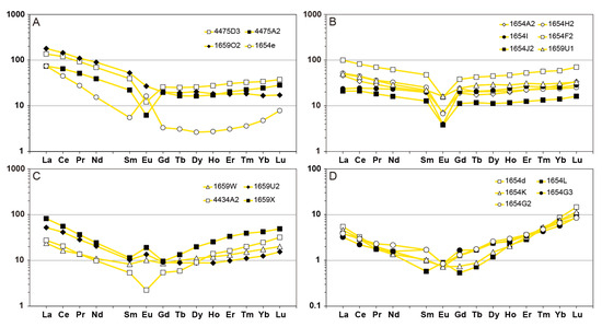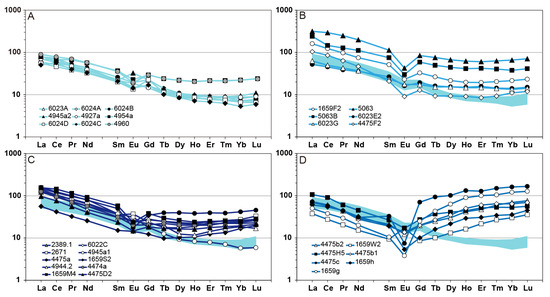 Chondrite-normalized rare earth element diagrams of garnet-rich rocks. (A) Magnetite-rich garnetites; (B) Quartz-rich garnetites; (C) Clinopyroxene-rich garnetites; (D) Biotite-rich garnetites. Normalization according to Sun and McDonough [55]. Source of data listed in Table S1.