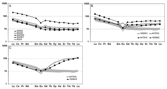 Chondrite normalized rare earth element diagrams of orthopyroxene-magnetite rich gneisses. (A) Group I; (B) Group II; (C) Group III. Normalization according to Sun and McDonough [55]. The field in gray represents the field of the most representative analyses in A. Source of data listed in Table S1.