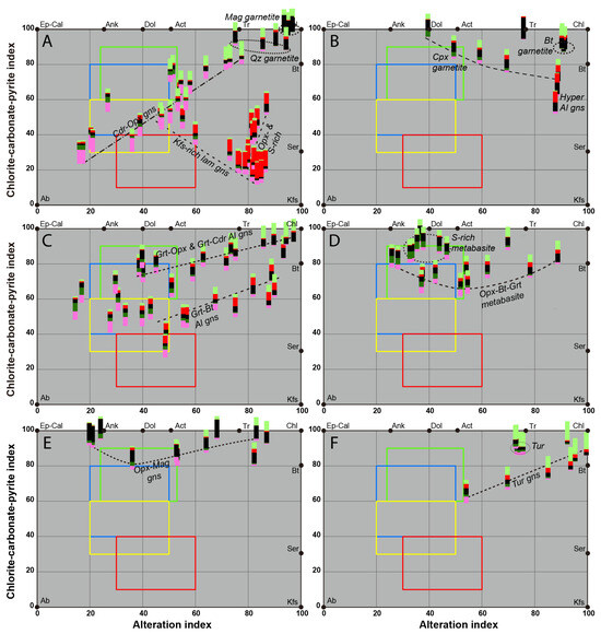 In the field, the recognition of stratigraphic markers across the BGC was challenging. However, the presence of coarse-grained minerals, their contents and their relative proportions allowed us to formulate a hypothesis about geochemical variations within similar rock types and among rock types and to assess the nature of alteration [4]. This enabled us to create a tentative alteration zonation pattern in the field based on the relative enrichments of K, Ca, Na, Al, Mg, Fe, Cu, and B recorded by the presence of unusual contents and atypical mineral assemblages of biotite, clinopyroxene, plagioclase, sillimanite, cordierite, garnet, orthopyroxene, phlogopite, magnetite, chalcopyrite, tourmaline, or kornerupine within gneisses [3,4,14,42]. These atypical mineral assemblages and mineral contents significantly differ from those of metamorphic rocks derived from common igneous or sedimentary protoliths.