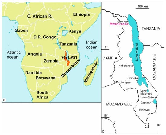 - Bromage, T.G.; Schrenk, F.; Juwayeyi, Y.M. Palaeobiogeography of the Malawi Rift: Age and vertebrate paleontology of the Chiwondo Beds, northern Malawi. J. Hum. Evol. 1995, 28, 37–57. [Google Scholar] [CrossRef]