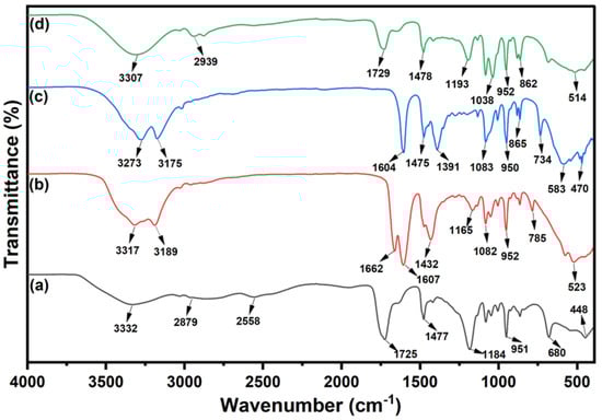 FTIR spectra of (a) ChCl:OA; (b) ChCl:U; (c) ChCl:TU; (d) ChCh:EG DESs.