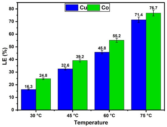 The influence of temperature on the leaching efficiencies of Cu and Co from a Cu–Co ore using aqueous ChCl:OA DES solution is depicted in Figure 6 under the specified conditions (t = 4 h, agitation = 400 rpm, particle size = −75 + 53 µm, S/L ratio = 1:10). The results indicate that temperature exerts a significant positive effect on the leaching efficiencies of both Cu and Co. As the temperature increased from 30 °C to 75 °C, the leaching efficiency of Cu steadily increased from 16.3% to 71.4%, while the leaching efficiency of Co also increased from 24.8% to 76.7%. This enhancement in leaching efficiency can be attributed to the increased kinetic energy of reactant molecules at elevated temperatures, which promotes more frequent and effective collisions between the DES and ore particles. Additionally, higher temperatures are likely to reduce the viscosity of the DES, thereby facilitating improved mass transfer and enhanced diffusion of reactants into the solid matrix [,]. The temperature-dependent behaviour observed in this study aligns with the general principles of chemical kinetics, where higher temperatures accelerate reaction rates by overcoming energy barriers [].