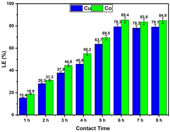 The effect of leaching time on the leaching efficiencies of Cu and Co from a Cu–Co ore using aqueous ChCl:OA DES solution is presented in Figure 7 under the specified conditions (T = 60 °C, agitation speed = 400 rpm, particle size= −75 + 53 µm, S/L ratio = 1:10). As shown in Figure 7, the leaching efficiencies of both Cu and Co increased significantly with time, reaching maximum values of 85.4% for Co and 79.3% for Cu at 6 h. This trend suggests that extended contact initially enhanced the interaction between the DES and the ore, leading to greater dissolution of both metals. The rapid increase in leaching efficiency during the first 5–6 h reflects the high availability of accessible reactive sites and efficient diffusional transport of the DES components. Interestingly, beyond 6 h, a slight decrease in leaching efficiencies was observed for both Cu and Co, with Cu dropping to 79.1% and Co to 84.9% at 8 h. This slight decrease could be attributed to the potential reprecipitation of metal ions in the solution or the depletion of active leaching agents within the leaching solvents []. The diminishing efficiency highlights the potential onset of competing reactions or the stabilisation of equilibrium conditions. Overall, these findings suggest that 6 h is the optimal leaching time for maximum recovery of Cu and Co under the studied conditions, as further prolongation of the process may result in marginal losses in metal extraction efficiency.