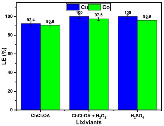 To determine the most effective aqueous DES solution for Cu and Co dissolution, various DES formulations were evaluated on CuO and CoO. The studied aqueous DES solutions were ChCl:OA, ChCl:EG, ChCl:U, and ChCl:TU. In addition, 1 M H2SO4 was included as a benchmark for comparison. The findings revealed considerable differences in leaching efficiencies, with aqueous ChCl:OA DES solution emerging as the top-performing DES, although 1 M H2SO4 demonstrated to be the most efficient among all the lixiviants, as depicted in Figure 3. Aqueous ChCl:OA DES solution achieved leaching efficiencies of 89.2% for Cu and 92.4% for Co, outperforming all other DES formulations. Aqueous ChCl:OA DES solution demonstrated the best efficiency because oxalic acid contributes strong acidity and excellent chelating ability, both of which are critical in breaking down metal oxides and forming stable, soluble metal complexes for effective leaching. OA is a dicarboxylic acid and a strong chelating agent. It forms stable complexes with metal ions such as Cu2+ and Co2+, due to its two carboxylate groups that can coordinate metal centres. In other words, the low pKa values of OA (pKa1 and pKa2 of OA are 1.3 and 4.3, respectively) ensure the availability of protons to disrupt the oxide lattice, making this DES highly effective []. Our previous work stressed the importance of pKa values of acids on the leaching of metals []. The study by Pateli et al. further corroborates the best efficiency demonstrated by ChCl:OA DES solution by their finding, which demonstrated that the solubility of metal oxides is higher in DESs with acidic HBDs such as oxalic, lactic, and levulinic acids []. This behaviour observed in DESs with acidic HBDs was linked to the presence of protons (H+) that act as oxygen acceptors (O−2), which break the metal–oxide bonds.