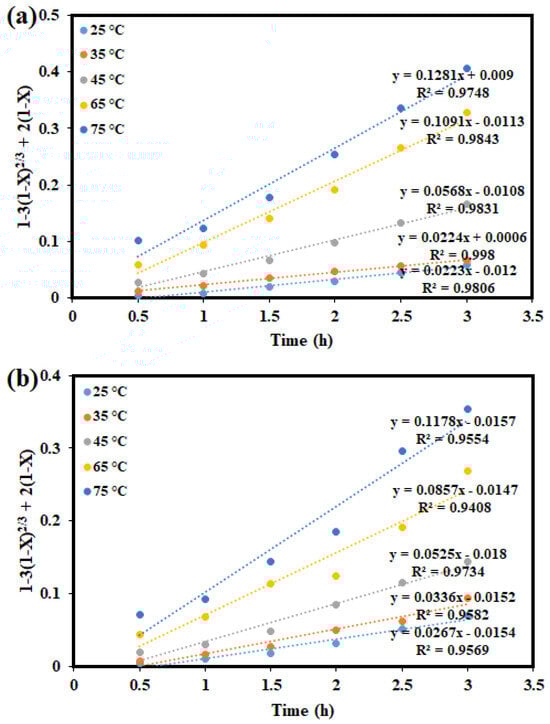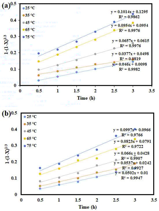 Hydrometallurgical ore processing, a heterogeneous process, requires the interplay of chemical reactions and mass transfer. A heterogeneous reaction can be expressed as R(fluid) + qS(solid) → fluid and/or solid products, where q represents the stoichiometric coefficient of the solid []. In the kinetic analysis of leaching, the shrinking-core model (SCM) is widely used to describe non-catalytic heterogeneous reactions [,]. The model assumes that the reaction begins at the outer surface of the particle, which is surrounded by a liquid film that enables mass transfer between phases []. As the reaction progresses, the reaction front moves inward, leaving behind fully reacted material and inert residue. This creates an unreacted core that gradually shrinks as the reaction continues. A permeable product layer forms around this core, while the original particle size is assumed to remain unchanged throughout the process [,]. The leaching behaviour of Cu and Co from a Cu–Co ore in the ChCl:OA + 1 M H2O2 solution was evaluated using various SCMs, including the diffusion through the product layer and chemical reaction models. The corresponding mathematical expressions for these models are presented in Equations (6) and (7), respectively. The dissolution kinetics were studied over a range of temperatures (25 °C, 35 °C, 45 °C, 65 °C, and 75 °C) and time intervals (0.5, 1.0, 1.5, 2.0, 2.5, and 3.0 h) using sample with particle size of −75 + 53 µm exposed to an agitation speed of 400 rpm and a 1:20 S/L.