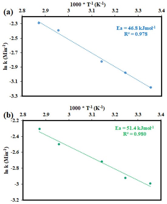Here, k represents the reaction rate constant, A is the pre-exponential factor, Ea denotes the apparent activation energy (kJ mol−1), R is the ideal gas constant (Jmol−1K−1), and T is the absolute temperature (K). The Ea can be determined by plotting T−1 against ln k and calculating the slope of the resulting linear fit.