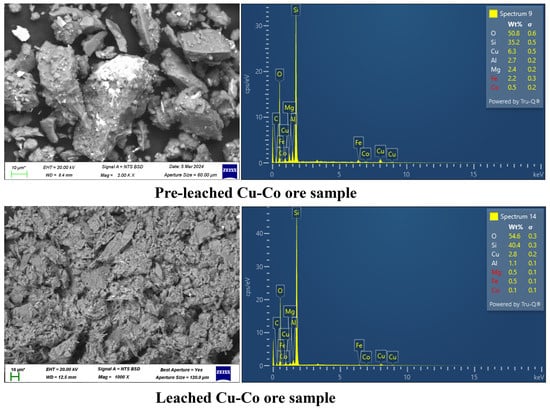 The residue obtained after leaching Cu and Co from the Cu--Co ore using ChCl:OA DES solution with addition of 1 M H2O2 (experimental conditions: t = 6 h, T = 75 °C, agitation = 400 rpm, particle size = −75 + 53 µm, S/L ratio = 1:20) was analysed using SEM and EDS, as shown in Figure 12. These analyses were conducted to evaluate the leaching efficiency and to characterise the changes in the morphology and chemical composition of the sample. The SEM image before leaching reveals a compact and aggregated structure with minimal surface irregularities. The EDS spectrum confirms the presence of significant quantities of Cu (6.2 wt.%) and detectable levels of Co (0.5 wt.%) on the surface, along with other elements such as O (50.9 wt.%), Si (34.7 wt.%), Mg (2.3 wt.%), Al (2.7 wt.%), and Fe (2.1 wt.%). The elevated oxygen content suggests the possible presence of oxides, while the silica detected might originate from associated gangue minerals. After leaching, the SEM image illustrates a profound transformation in the sample’s morphology. The surface appears porous and heavily corroded, characterised by pits and voids, indicative of material dissolution during the leaching process. The corresponding EDS spectrum demonstrates the leaching of the Cu content, reduced to 5.8 wt.%, while Co is reduced to 0.2 wt.%. These results suggest the successful extraction of both Cu and Co. The EDS results also showed that Metals like Mg, Al, and Fe were leached to some extent. However, they are not of interest to us in this study. They will be separated in the future during the separation phase of this project. It should be noted that while EDS provides useful qualitative and semi-quantitative insights, its accuracy for element quantification is limited. It should also be noted that the elemental compositions reported from EDS represent surface-level weight percentages, as EDS is a surface-sensitive technique. These values reflect the relative abundance of elements on the sample surface rather than in the bulk material. The combined SEM-EDS results confirm that the leaching process under the given experimental conditions was effective in extracting Cu and Co, leaving behind a silica-rich residue. The corroded and porous morphology of the residue aligns with the removal of metals from the ore matrix. This characterisation underscores the efficiency of the applied conditions in recovering valuable metals while leaving behind a chemically inert residue.