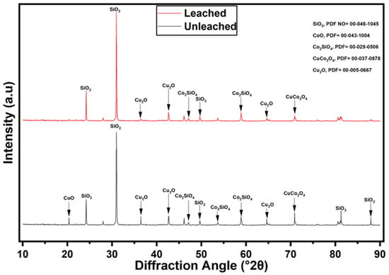 Furthermore, the XRD analysis of the Cu–Co ore before and after leaching with aqueous ChCl:OA DES solution and 1 M H2O2 reveals significant mineralogical transformations (Figure 13). The unleached sample is predominantly composed of silicon dioxide (SiO2, quartz), cobalt (II) oxide (CoO), copper (I) oxide (Cu2O), cobalt silicate (Co2SiO4), and copper cobalt oxide (CuCo2O4), with SiO2 being the most prominent phase. Phase identification was performed using DIFFRAC.SUITE EVA v4.2.1, in conjunction with the PDF-2 RELEASE 2016 RDB database and the corresponding PDF reference codes, are provided in Figure 13. After leaching under optimised conditions (leaching solvent = ChCl:OA + 1 M H2O2, t = 6 h, T = 75 °C, agitation = 400 rpm, particle size = −75 + 53 µm, S/L ratio = 1:20), a marked reduction in the intensity of Cu2O, CoO, and CuCo2O4 reflections is observed, indicating dissolution of Cu and Co-bearing phases. The persistent and intense reflections of SiO2 suggest its chemical stability under the leaching conditions. Additionally, the relative intensity reduction in certain peaks implies partial dissolution and structural modification of some residual phases. These results confirm the effectiveness of the aqueous ChCl:OA DES system with 1 M H2O2 in leaching Cu and Co, while silicate-based minerals such as quartz remain largely inert. For instance, the persistent presence of cobalt in the silicate phase (Co2SiO4) after leaching, as seen in Figure 13, indicates that this fraction remains largely refractory under the applied conditions, representing a minor portion of the total Co content of the investigated ore may require more aggressive treatment for complete dissolution.