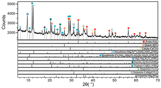 The chemical composition of the low-grade Pt-Pd concentrates is shown in Table 1. Figure 1 shows the X-ray diffraction (XRD, Smartlab 9KW) analysis image of the main phases. The results indicated that the Fe grade was 15.32%, and the S grade was 14.15%. They existed mainly in the form of FeS2. The gangue composition included 25.97% SiO2, CaCO3, and various ferrimafic silicate minerals. This mineral is characterized by high contents of SiO2, MgO, Fe, and S. The CaO, Al2O3, and Cr contents are low. The iron ore was sourced from an iron ore manufacturer in Yimen County, Yunnan Province, China. Its main component is Fe3O4, along with impurities such as SiO2, CaO, and MgO. Since these impurities are also present in platinum-palladium ores, they will not interfere with the experiments. The iron content in the iron ore is 60.55 wt%.