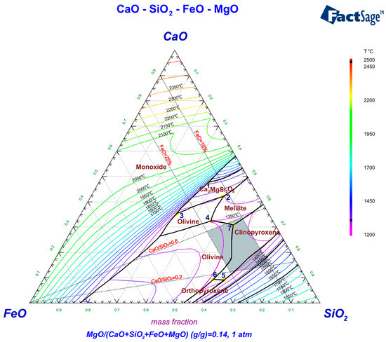 The melting point of slag typically denotes the temperature at which it transitions from a solid phase to a homogeneous liquid state, which can be approximately assessed by the liquidus temperature on the phase diagram. Based on composition analysis, the PGM concentrate is primarily comprised of SiO2, MgO, and FeS2. An increased concentration of MgO in the concentrate indicates a higher melting point, necessitating the use of fluxing agents to reduce this melting point. To avoid the introduction of new elements, SiO2 and CaO found in the concentrate are selected as fluxing agents, along with the addition of FeO. FeO functions not only as a flux to modify the melting point of the slag but is also partially transformed to metallic iron or iron sulfide, which acts as a collector for precious metals. Therefore, the slag composition is established as CaO-SiO2-FeO-MgO. Given that the MgO content in the slag can range from 12% to 16% depending on the experimental conditions, a MgO content of 14% is designated as representative of the discussion of the low melting point range of the slag, as illustrated in Figure 2. The minimum melting point for this system is 1311 °C at eutectic point 7. To ensure a lower melting temperature and conserve energy, a smelting temperature of 1350 °C was selected. At this temperature, the slag composition within the 1350 °C liquidus range exhibited better melting performance. Therefore, the range of smelting experimental conditions can be determined as follows: CaO/SiO2 from 0.2 to 0.6 and FeO content from 15% to 25%. This slag composition range is represented in the gray area on the phase diagram. The slag composition basically fits the liquidus at 1350 °C, and the slag is composed of clinopyroxene (MgCaSi2O6, FeCaSi2O6), melilite (Ca2Mg (Si2O7)), and olivine (Fe2SiO4).