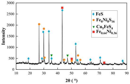A preliminary smelting experiment was conducted by mixing 100 g of concentrate with 18 g of CaO, 22 g of SiO2, and 30 g of iron ore. The mixture was smelted at 1350 °C for 2 h. Microstructural morphology and phase identification of the matte sample were performed utilizing SEM-EDS and XRD techniques, respectively. The results are shown in Figure 3 and Figure 4, respectively.