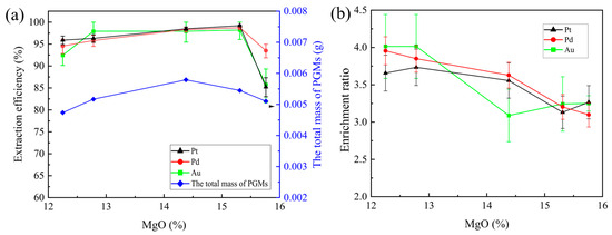 The extraction efficiency of Pt, Pd, and Au, as well as the total mass of the PGMs (a) and the enrichment ratios of Pd, Pt, and Au (b), as a function of the MgO%.