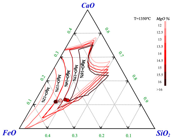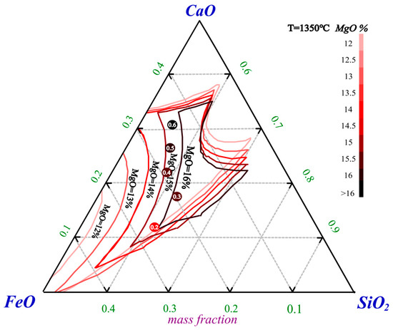 Ternary phase diagrams for CaO-FeO-SiO2 with MgO contents of 12%, 13%, 14%, 15%, and 16% were plotted using FactSage. The liquidus at 1350 °C for different MgO contents was overlaid on a single-phase diagram, as shown in Figure 6. The experimental data were plotted according to the ternary composition, with the MgO content was distinguished by color.