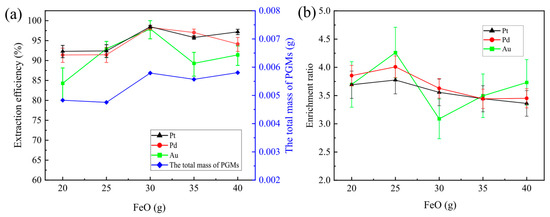 With increasing amounts of iron ore, the enrichment efficiency of Pt, Pd, and Rh, as well as the total mass of the precious metals, tended to increase, peaked when the iron oxide amount was 30 g, and then slightly declined. The enrichment factors of Pt and Pd showed an overall decreasing trend with increasing FeO content, while Au exhibited significant fluctuation.