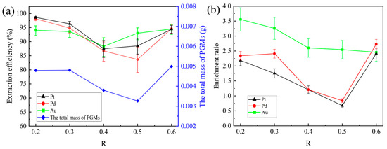 The extraction efficiency of Pt, Pd, and Au, as well as the total mass of the PGMs (a) and the enrichment ratios of Pd, Pt, and Au (b), which varied with changes in basicity.